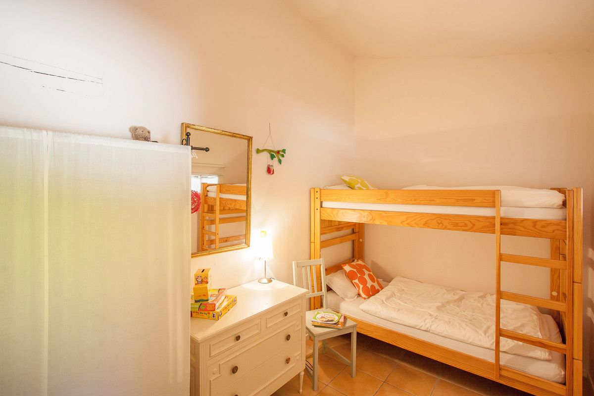 The spacious master bedroom has Toile de Jouy curtains with blackout linings, a Super King size bed, an antique wardrobe and a chest of drawers providing ample storage space. In the children’s bedroom you will find sturdy bunk beds (there is space to put up an additional toddler bed) as well as a wardrobe and a chest of drawers. The curtains are also blackout lined, so that little ones are not woken by early morning sunshine. Either bedroom can accommodate a cot.